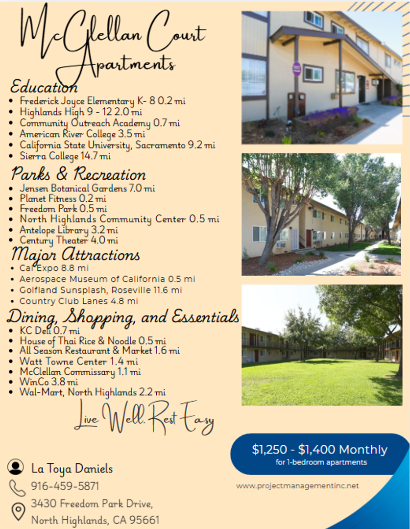 Stop overpaying for comfort! McClellan Court Apartments in North Highlands gives you quick access to Sacramento, Roseville, Carmichael, and Citrus Heights—all without the high-market rent.